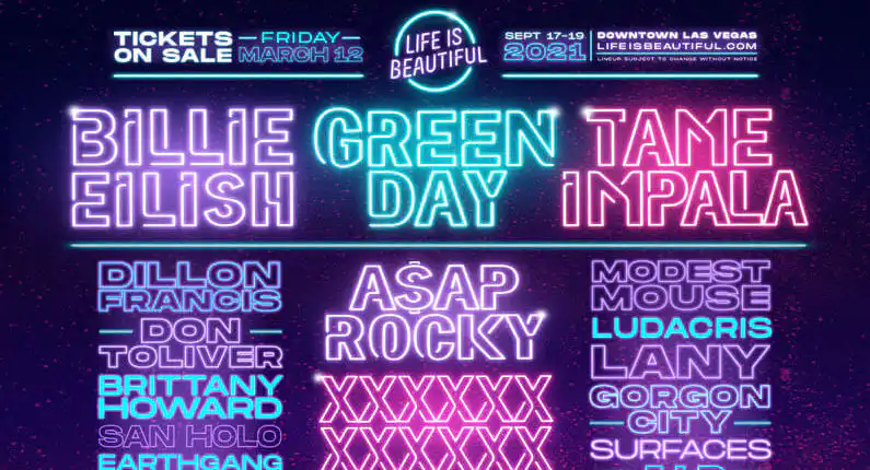 Green Day were announced today as one of the headliners of the 2021 edition of the Life Is Beautiful music and arts festival in Las Vegas. The festival is set to take place between September 17-19 and will also feature Billie Eilish, Tame Impala and A$AP Rocky on the top of the bill. The festival was cancelled last year due to the Coronavirus pandemic but organizers are working with local and state officials to ensure that this year’s edition can take place safely.